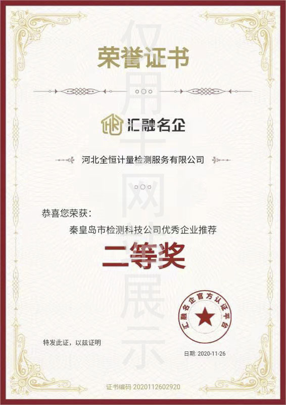 秦皇島市檢測科技有限公司優(yōu)秀企業(yè)推薦二等獎證書